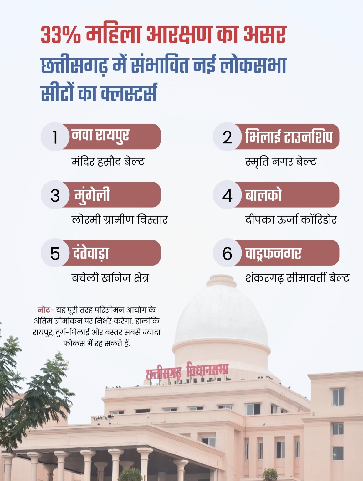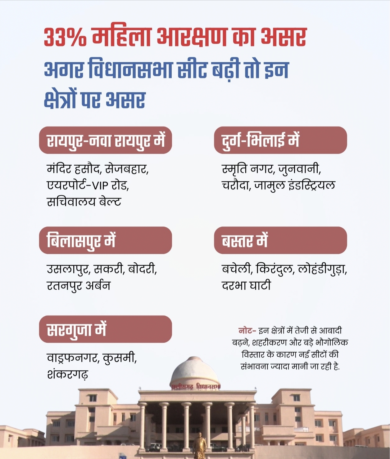 33% महिला आरक्षण से छत्तीसगढ़ में भी बदलेगा चुनावी नक्शा, लोकसभा-विधानसभा सीटों का संभावित ब्लूप्रिंट समझिए रायपुर. 33% महिला आरक्षण को 2029 लोकसभा चुनाव से पहले लागू करने की केंद्र सरकार की तैयारी अब छत्तीसगढ़ की राजनीति पर भी सीधा असर डालती दिख रही है. 2011 की जनगणना के आधार पर परिसीमन, लोकसभा सीटों को 543 से बढ़ाकर 816 करने का प्रस्ताव और विधानसभाओं में भी आनुपातिक बढ़ोतरी इन तीन फैसलों से छत्तीसगढ़ में 11 लोकसभा और 90 विधानसभा सीटों का भी चुनावी नक्शा बदल सकता है.महिला आरक्षण के साथ तैयारी में जुटे दलराजनीतिक जानकार एवं वरिष्ठ पत्रकार अनिरुद्ध दुबे की माने तो इस बदलाव को लेकर अभी से ही राजनीतिक दल अपनी रणनीति बनाने में जुट चुके हैं. यदि छत्तीसगढ़ की राजधानी रायपुर की बात की जाए तो यहां वर्तमान में चार विधानसभा सीट है जिसके बढ़कर 6 होने की संभावना है. जानकारी के मुताबिक भाजपा हो या कांग्रेस दोनों ही राजनीतिक दलों ने इन बढ़ी हुई सीटों को टारगेट करते हुए अभी से ही अपनी तैयारी शुरू कर दी है.हाल ही में केंद्रीय गृह मंत्री अमित शाह ने विभिन्न दलों के सांसदों के साथ बैठक की. इससे साफ है कि सरकार नारी शक्ति वंदन अधिनियम को 2029 से लागू करने के लिए 2011 जनगणना आधारित परिसीमन का रास्ता अपनाना चाहती है. इसके तहत लोकसभा सीटें 543 से बढ़कर 816 हो सकती है, साथ ही महिलाओं के लिए 273 सीटें आरक्षित हो सकती हैं.छत्तीसगढ़ में असरइसका सीधा असर छत्तीसगढ़ पर इसलिए होगा क्योंकि अगर राज्यों का मौजूदा अनुपात लगभग बरकरार रखा गया, तो राज्य की 11 लोकसभा सीटें बढ़कर 16–17 तक जा सकती हैं. उसी फॉर्मूले पर विधानसभा सीटों में भी बढ़ोतरी संभव है.अगर लोकसभा की बात की जाए तो अभी छत्तीसगढ़ में 11 लोकसभा सीटें हैं. इसमें रायपुर, दुर्ग, बिलासपुर, कोरबा, बस्तर और सरगुजा जैसे बड़े संसदीय क्षेत्र हैं. जनसंख्या और भौगोलिक विस्तार के हिसाब से ये सबसे ज्यादा प्रभावित हो सकते हैं. अगर राष्ट्रीय स्तर पर 50% के आसपास विस्तार मॉडल लागू हुआ, तो छत्तीसगढ़ में संभावित नई लोकसभा सीटें इन क्षेत्रों से निकल सकती है.विधानसभा सीटों का गणितराज्य में फिलहाल 90 विधानसभा सीटें हैं. अगर लोकसभा की तरह यहां भी आनुपातिक सीट विस्तार हुआ, तो यह संख्या 110–120 या उससे अधिक जा सकती है. हालांकि अगर अगर सीटें 90 ही रहती हैं तो फिर महिला आरक्षित सीटें 30 हो जाएंगी. वहीं अगर सीटें 120 तक होती हैं तो महिला आरक्षित सीटें 40 हो जाएंगी. यानी यहां फिर वही बात साफ है आरक्षण 33% रहेगा, सीटों की संख्या बढ़ने पर महिलाओं के हिस्से की सीटें बढ़ेंगी. राजनीतिक असर: छत्तीसगढ़ में किसकी बढ़ेगी चिंता?इस फैसले का सबसे बड़ा असर भाजपा और कांग्रेस दोनों के टिकट वितरण पर पड़ेगा. करीब 30 से 40 सीटें महिला आरक्षित हो सकती 