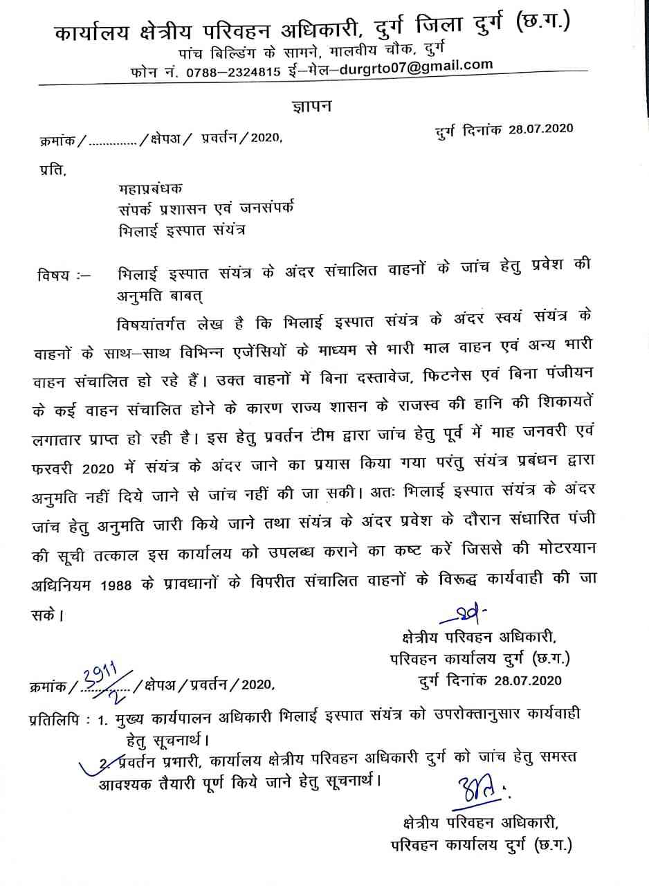 भिलाई28/07/2020- । भिलाई स्टील प्लांट के अंदर चल रहे अनफिट और कंडम वाहनों की जांच होगी। इसके लिए क्षेत्रीय परिवहन अधिकारी ने जांच के लिए बीएसपी प्रबंधन को पत्र लिखा है। और जवाब मांगा है। अब ऐसे लग रहा है कि जल्द ही बीएसपी में सालों से चल रहे इस भ्रष्टाचार का जल्द ही खात्मा होने वाला है और सरकार को नुकसान पहुंचाने वाले अधिकारियों पर भी बड़ी कार्यवाही होने की भी संभावना नजर आ रही। आरटीओ दुर्ग ने पत्र में कहा है। कि बीएसपी के अंदर स्वयं संयंत्र के वाहनों के साथ-साथ विभिन्न एजेंसियों के माध्यम से भारी माल वाहन व अन्य भारी वाहन संचालित हो रहे हैं। इन वाहनों में दस्तावेज, फिटनेस और बिना पंजीयन के कई वाहन संचालित होने के कारण राज्य शासन को राजस्व की बड़ी हानि की शिकायत लगातार प्राप्त हो रही है। इसके लिए प्रवर्तन टीम द्वारा जांच के लिए पूर्व में जनवरी और फरवरी 2020 में संयंत्र के अंदर जाने का प्रयास किया गया परन्तु प्रबंधन द्वारा अनुमति नहीं दी गई। इसलिए जांच नहीं हो पाई। अभी दोबारा शिकायत मिली है। जिसकी जांच होनी है। इसलिए प्रवेश की अनुमति दे।