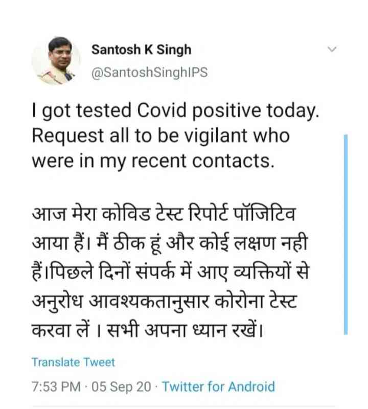 अतुल शर्माएसपी संतोष कुमार सिंह कोरोना पॉजिटिव पाए गए हैं । इसकी जानकारी उन्होंने अपने ऑफिसियल ट्विटर एकाउंट से ट्वीट कर दी है ।उन्होंने ट्वीट कर लिखाआज मेरा कोविड टेस्ट रिपोर्ट पॉजिटिव आया हैं । मैं ठीक हूं और कोई लक्षण नही हैं।पिछले दिनों संपर्क में आए व्यक्तियों से अनुरोध आवश्यकतानुसार कोरोना टेस्ट करवा लें । सभी अपना ध्यान रखें ।
