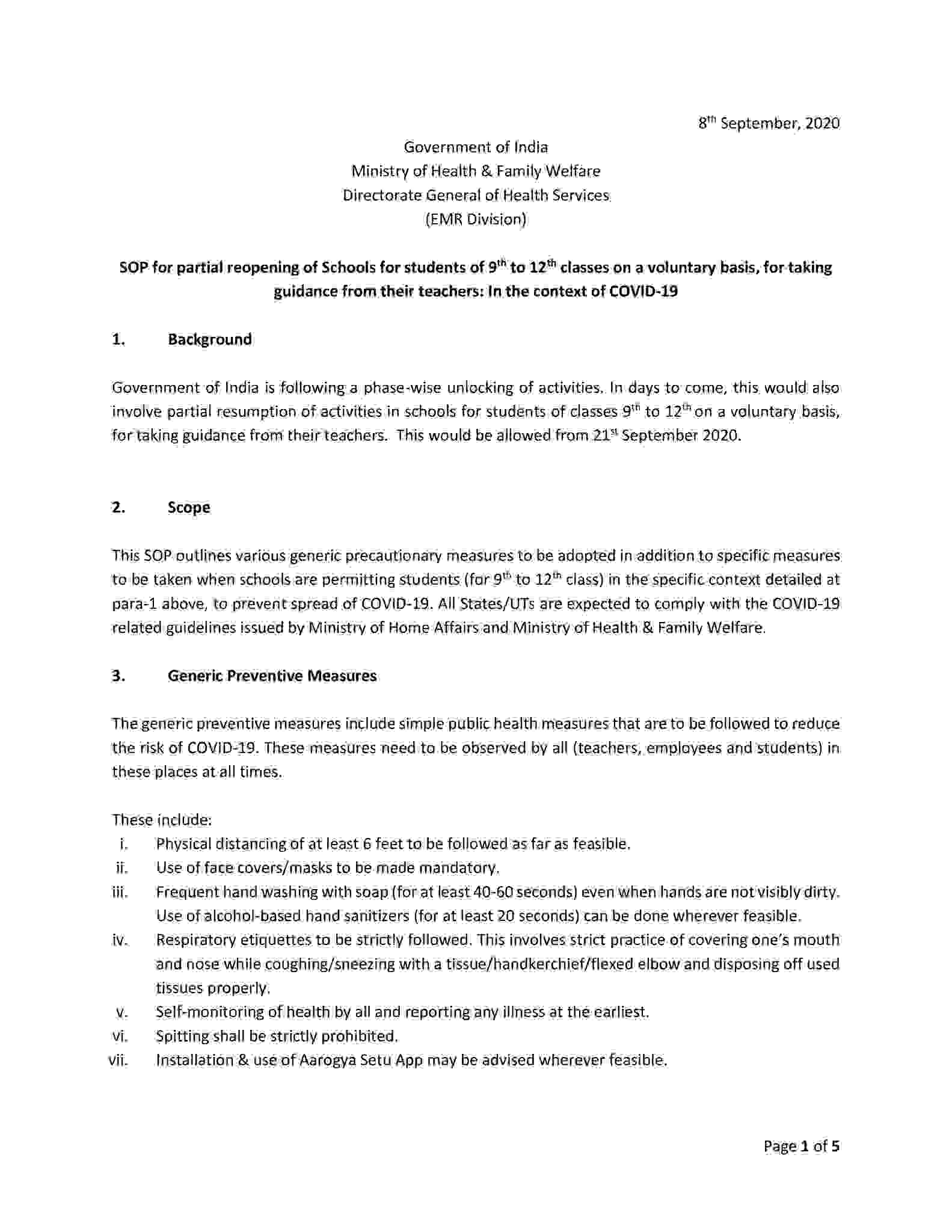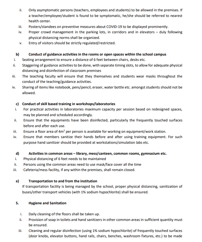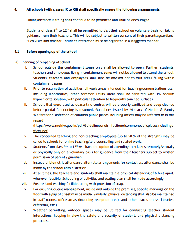 केंद्रीय स्वास्थ्य मंत्रालय की तरफ से नौवीं से 12वीं के छात्रों के लिए स्कूलों को फिर से खोलने के लिए जारी SOP में कहा गया है कि ऑनलाइन/डिस्टेंस लर्निंग की अनुमति जारी रहेगी। स्कूल अधिकतम अपने 50 प्रतिशत टीचिंग और नॉन टीचिंग स्टाफ को ऑनलाइन टीचिंग/टेलि-काउंसलिंग और इससे जुड़े दूसरे कामों के लिए बुला सकते हैं। नौवीं से 12वीं तक के छात्र अगर अपने शिक्षकों से मार्गदर्शन लेने के लिए स्कूल जाना चाहेंगे तो उन्हें इसकी इजाजत होगी। हालांकि इसके लिए उन्हें अपने माता-पिता या अभिभावकों से लिखित सहमति लेनी होगी। छात्रों के पास ऑनलाइन पढ़ाई का विकल्प भी मौजूद रहेगा।लैब से लेकर क्लासेज तक के छात्रों के बैठने की ऐसी व्यवस्था करनी होगी कि उनके बीच कम से कम 6 फीट की दूरी को बरकरार रखा जाए। छात्रों के इकट्ठा होने यानी असेंबली और खेलकूद से जुड़ी गतिविधियों की मनाही होगी क्योंकि इससे संक्रमण के फैलने का जोखिम होगा। स्कूलों में स्टेट हेल्पलाइन नंबरों के अलावा स्थानीय स्वास्थ्य अधिकारियों के नंबर भी डिस्प्ले होंगे ताकि किसी इमर्जेंसी की स्थिति में उनसे संपर्क किया जा सके।कंटेनमेंट जोन्स में रहने वाले टीचर या कर्मचारियों को स्कूल जाने की इजाजत नहीं है। वैसे स्कूल जिनका इस्तेमाल क्वारंटीन सेंटर के रूप में हुआ था, उन्हें आंशिक तौर पर खोले जाने से पहले अच्छी तरह से सैनिटाइज करने का निर्देश दिया गया है। इसके अलावा सभी स्कूलों को हाइपोक्लोराइट सोलूशन से सैनिटाइज करने के निर्देश दिए गए हैं।