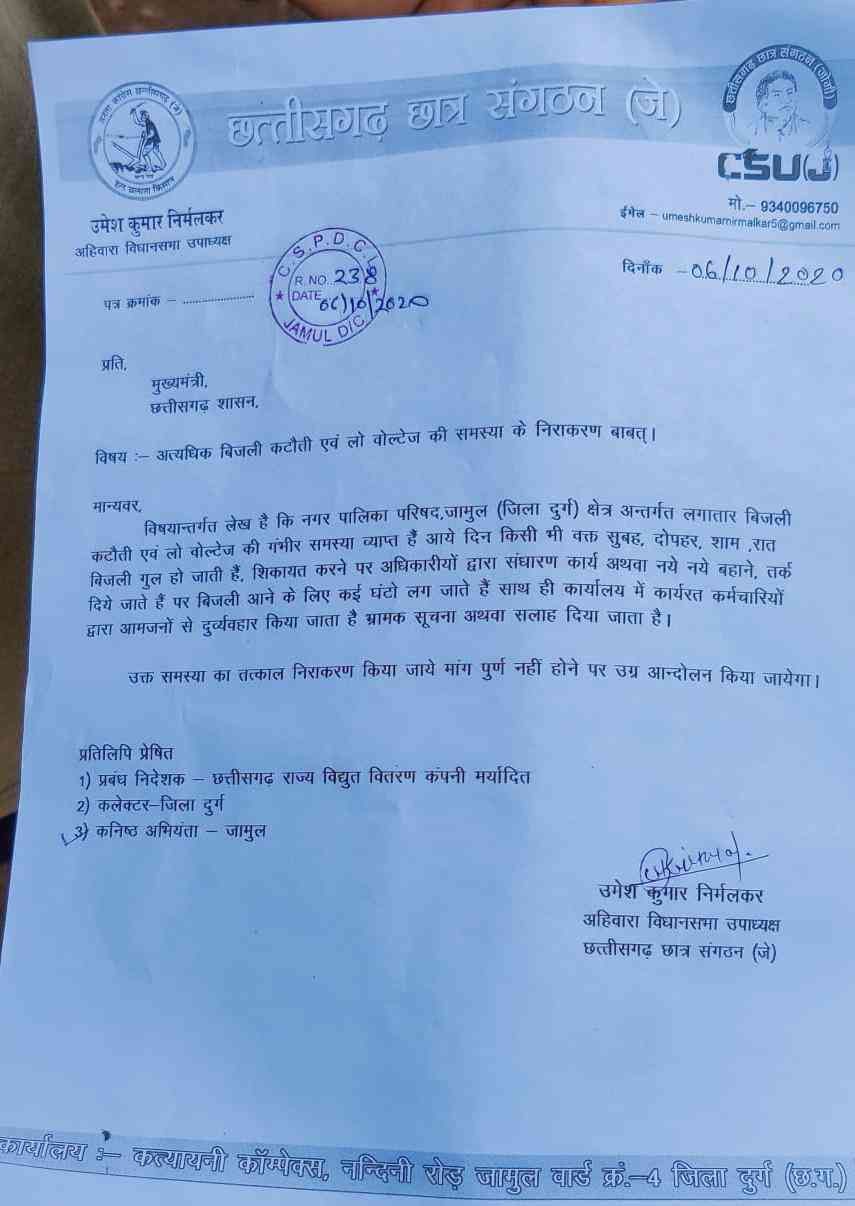 ज्ञात हो कि है कि नगर पालिका परिषद,जामुल (जिला दुर्ग) क्षेत्र अन्तर्गत लगातार बिजली कटौती एवं लो वोल्टेज की गंभीर समस्या व्याप्त है आये दिन किसी भी वक्त सुबह, दोपहर, शाम ,रात बिजली गुल हो जाती हैं । शिकायत करने पर अधिकारीयों द्वारा संधारण कार्य का अथवा नये - नये बहाने/तर्क दिये जाते हैं । पर बिजली आने के लिए कई घंटो लग जाते हैं । साथ ही कार्यालय में कार्यरत कर्मचारियों द्वारा आमजनों से दुर्व्यवहार किया जाता है। भ्रामक सूचना अथवा सलाह दिया जाता है।।उक्त समस्या के तत्काल निराकरण कि मांग कि गई है मांग पुर्ण नहीं होने पर उग्र आन्दोलन कि चेतावनी दी गई है । साथ विधानसभा अध्यक्ष संजय गुरूपंच, विकास मिश्रा,आशुतोष,शिवम,मनीष गुप्ता ,