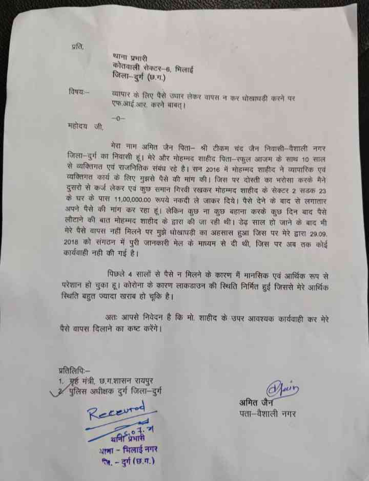अतुल शर्माभिलाई। युवा कांग्रेस के राष्ट्रीय सचिव मो. शाहिद के खिलाफ एक और धोखाधड़ी का मामला सामने आया है। युवा कांग्रेस के वर्तमान प्रदेश सचिव अमित जैन ने कोतवाली थाना सेक्टर-6 में शिकायत दर्ज कराते हुए कार्रवाई की मांग की है। एक समय में मो. शाहिद और अमित जैन जिगरी दोस्त हुआ करते थे।अमित जैन ने अपनी शिकायत में पुलिस को बताया है कि, मेरे और मोहम्मद शाहिद पिता-रफुल आजम के साथ 10 साल से व्यक्तिगत एवं राजनितिक संबंध रहे हैं। सन् 2016 में मोहम्मद शाहिद ने व्यापारिक एवं व्यक्तिगत कार्य के लिए मुझसे पैसे की मांग की। जिस पर दोस्ती का भरोसा करके मैंने दूसरों से कर्ज लेकर एवं कुछ सामान गिरवी रखकर मोहम्मद शाहिद के सेक्टर-2 सड़क-23 के घर के पास 11 लाख रुपए नकदी ले जाकर दिये। पैसे देने के बाद से लगातार अपने पैसे की मांग कर रहा हूं। लेकिन कुछ ना कुछ बहाना करके कुछ दिन बाद पैसे लौटाने की बात मोहम्मद शाहिद द्वारा की जा रही थी। डेढ़ साल हो जाने के बाद भी मेरे पैसे वापस नहीं मिलने पर मुझे धोखाधड़ी का अहसास हुआ जिस पर मेरे द्वारा 29 सितंबर 2018 को संगठन में पूरी जानकारी मेल के माध्यम से दी थी। जिस पर अब तक कोई कार्रवाई नहीं की गई है।पिछले 4 सालों से पैसे न मिलने के कारण मैं मानसिक एवं आर्थिक रूप से परेशान हो चुका हूं। कोरोना के कारण लाकडाउन की स्थिति निर्मित हुई। जिससे मेरे आर्थिक स्थिति बहुत ज्यादा खराब हो चूकि है। अतः आपसे निवेदन है कि मो. शाहीद के उपर आवश्यक कार्यवाही कर मेरे पैसे वापस दिलाने का कष्ट करेंगे।इस मामले में प्रदेश सचिव अमित जैन ने भिलाई टाइम्स से कहा, यह मेरा व्यक्तिगत मामला है। व्यक्तिगत व्यापार के लिए मो. शाहिद ने पैसे मांगे थे। 11 लाख रुपए किसी अन्य से कर्जा लेकर दिया था। 2016 में दिया था। एक रुपए तक नहीं लौटाया।