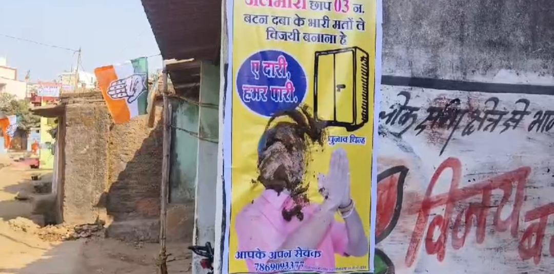 दुर्ग जिले के अंतर्गत आने वाले नगर पंचायत उतई के वार्ड क्रमांक 5 में एक विवाद सामने आया है, जिसमें निर्दलीय पार्षद सतीश पारख के पोस्टरों पर गोबर पोते जाने की घटना हुई है।