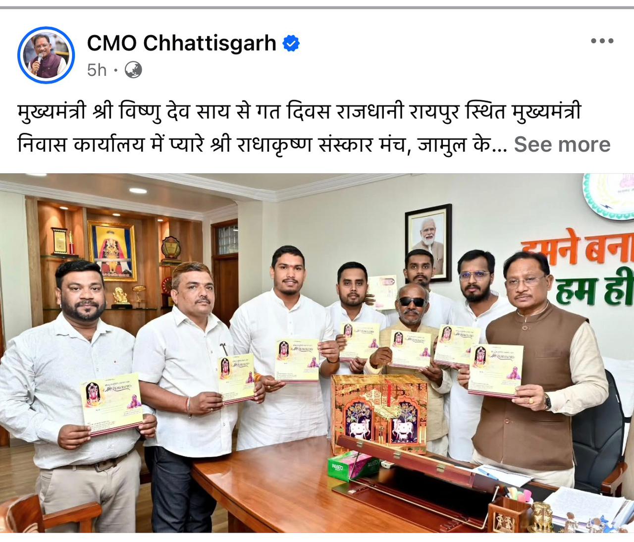 रायपुर // छत्तीसगढ़ के मुख्यमंत्री विष्णु देव साय ने मुख्यमंत्री निवास में जामुल स्थित शिवपुरी स्टेडियम में प्रस्तावित दिव्य–भव्य श्री राम कथा महोत्सव के आमंत्रण पत्र एवं वार्षिक कैलेंडर का ससम्मान विमोचन किया। कैलेंडर पर अंकित प्रभु श्री रामलला की तेजोमय छवि निहारकर मुख्यमंत्री ने गहन श्रद्धा व्यक्त की और इस आयोजन को छत्तीसगढ़ की सनातन परंपरा, सांस्कृतिक गरिमा व आध्यात्मिक चेतना का अनुपम उत्सव बताया।मुख्यमंत्री ने रामकथा में पहुचने का दिया आश्वाशन, आयोजक समिति को दिया साधू वाद उन्होंने कहा कि कैलेंडर विमोचन के साथ यह आयोजन आधिकारिक रूप से जन–जन तक पहुँचने वाले भक्ति–संस्कृति के विराट अभियान में परिवर्तित हो गया है।यह नौ दिवसीय श्री राम कथा (29 दिसंबर 2025 – 6 जनवरी 2026) अयोध्या धाम के जगद्गुरु रामानुजाचार्य स्वामी डॉ. राघवाचार्य जी महाराज की पावन वाणी से संपन्न होगी।इस दौरान कार्यक्रम के संरक्षक संयोजक ईश्वर उपाध्याय, जागेश्वर मल सोनी, उमेश निर्मलकर, नेत राम साहू, जितेंद्र साहू, इंद्रजीत उपाध्याय, वैभव उपाध्याय सहित अन्य सदस्य एवं जामुल निवासी उपस्थित रहे।